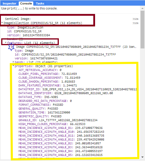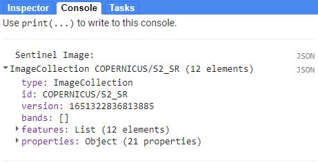- print() ile console ekranına imagecollection’a ait görüntü bilgilerini yazdıralım.