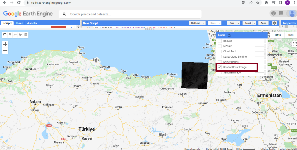 NOT: Map.addlayer() görselleştirme katmanında uyguladığımız adımları direk haritada görmek için sondaki parametrenin ‘true’ olarak seçilmesi gerekir, ‘false’ olarak seçili olduğunda harita üzerinde ‘Layers’ üzerine gelerek eklediğimiz katmanı seçmemiz gerekir.