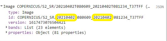 İlk görüntümüzü import ederken başlama tarihi olarak 2021/04/01 tarihini vermiştik bu koleksiyon içerisinden .first() komutu ile ilk görüntüyü çektiğimizde ise gelen ilk görüntünün 2021/04/02 tarihinde olduğunu görüyoruz. Demek ki belirtilen çalışma alanı için tanımladığımız tarih aralığındaki ilk görüntü 2021/04/02 tarihinde varmış.