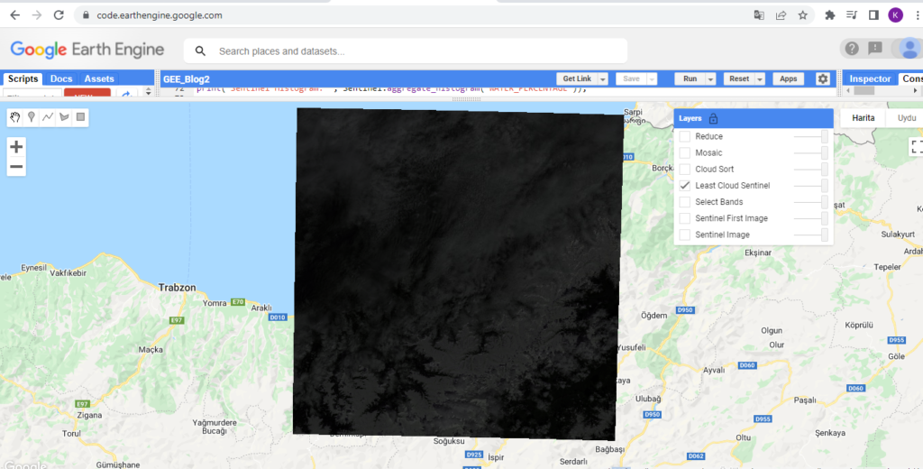 Aşağıdaki kod ile Sentinel görüntü koleksiyonundan en düşük bulut oranına sahip değişkenler sıralandı ve ilki alındı.