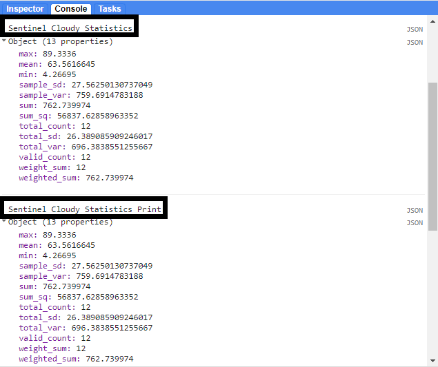 print('Sentinel Cloudy Statistics Print: ', Sentinel.aggregate_stats('CLOUDY_PIXEL_PERCENTAGE'));